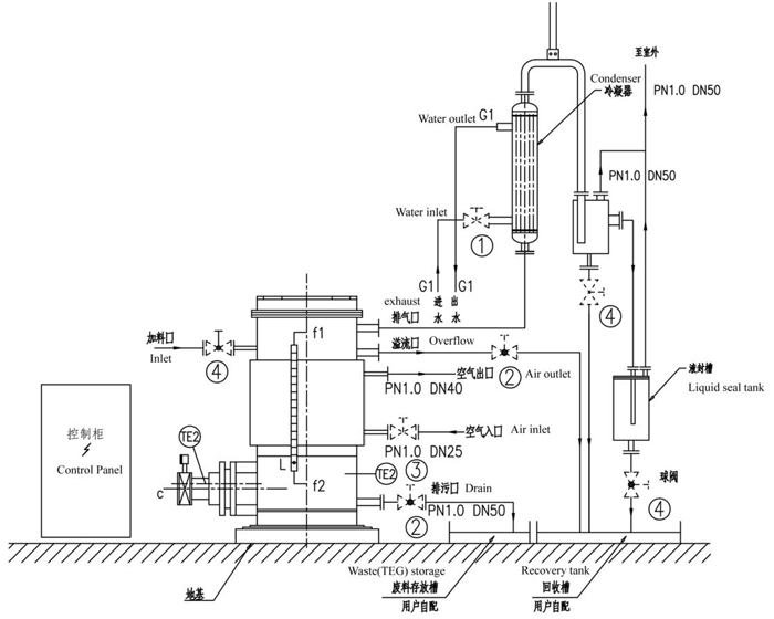 Workpiece basket: 280pcs spinnerets can be placed §Structural features TEG cleaning device composed of a furnace body, a condenser and a liquid seal tank, stainless steel basket and electrical control system. The electric heating element is directly inserted into the TEG solution to heat, and the furnace cover is opened for cylinder driving.The upper part of the cylinder body is provided with an overflow port, a feeding port and a condenser interface, and the bottom is provided with a sewage outlet, a heater mounting port, a hand hole, etc.. In order to shorten the opening time of the equipment after cleaning and improve the utilization rate of the equipment, a cooling jacket is arranged outside the cleaning groove barrel.The magnetic coupling turned column level meter shows the furnace level, level meter with low liquid level alarm protection function.The electric heating element junction box is a positive pressure explosion isolation structure, the filling medium is pressure air, and is interlocked with the heater, that is, when the junction box has no pressure, the heater does not act. Because the furnace cover is heavier, the cylinder is used to open the furnace cover, which is convenient for operation, reduces labor intensity and improves work efficiency. § Materials of Device 1、Tank body and furnace lid using SUS304 & 6mm board to produce, do pressure testing, leakage check after forming. 2、The jacket made of 5mm heat-resisting stainless steel plate, by GB-150 steel container standard making; 2mm stainless steel for shell ; between the outer panel and cylinder filled with high-quality aluminum silicate cotton insulation, all appearance welds are kerosene leakage test, and the protection plate on the bottom of the furnace mouth with thickness beyond the insulation layer in the fan-shaped. In order to prevent the basket hanging out the TEG medium drops into the cotton insulation caused security accident. 3、Contact with TEG flanges and steel pipe, the materials are heat-resistant stainless steel. 4、Level gauge:the use of stainless steel magnetic coupling plate type level gauge, and with the level lower limit alarm. 5、Electric heater: stainless steel heating pipe, heating power 60kW, composed of 33 "U" type stainless steel electric heating element welded flange directly into the furnace in the TEG medium heating, each power 2kw, the actual use of 30, the other three spare, the electric heating wire is made of Ni20Cr80 alloy (Shanghai Alloy factory produced) the service life of the heater is not less than three years. 6、Hanging basket: stainless steel material, 7 layers cleaning spinnerets. Heat-resistant stainless steel. 7、Condenser: stainless steel material, shell and tube type structure, condensing area is 3.5m2. 8、Pneumatic components: cylinder, manual valve, steam source triple 9、Insulation cotton: high - temperature aluminum silicate cotton; §Control system According to the working principle and requirements of TEG cleaning furnace, the use of two sets of instrument control, one set of instruments to control the electric heater temperature and has anti-dry protection, another instrument control TEG medium temperature. Two sets of instrument safety interlock, double protection, when over-temperature, cut off the heating main power, and sound and light alarm, to ensure the normal operation of equipment and fault self-protection. The instrument has PID manual and can auto-tuning to set the best parameters, input excellent control signal to drive the heating control device (solid state relay), heating control device with automatic temperature cooling and fault self-diagnosis protection to ensure temperature control accuracy. At the same time,double-cut function has both time and temperature, ensure the cleaning effect. In order to ensure the safe use of the equipment, the heater and magnetic coupling plate level gauge interlock protection --- when the TEG below the set level, the heating element does not work; heater junction box without pressure, heating component does not work; condenser without water or water pressure is too low, the system alarm and automatically cut off the source. The cleaning process ends, the system has an automatic shutdown function. §Flowchart ![]() Supporting device-Alkali/ Water cleaning device (ACD/WCD series) ![]() §1.Configuration 1. Device Model :ACD-1015/WCD-1015 ?。╡ach one)