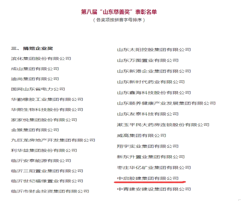近日,山東省民政廳印發(fā)《關(guān)于表彰第八屆“山東慈善獎(jiǎng)”獲得者的決定》,對2020年10月至2022年12月期間在山東省慈善領(lǐng)域作出突出貢獻(xiàn)的先進(jìn)典型予以表彰,授予100個(gè)愛心個(gè)人、愛心團(tuán)隊(duì)、捐贈企業(yè)、慈善項(xiàng)目第八屆“山東慈善獎(jiǎng)”。其中,慈善楷模10個(gè)、捐贈個(gè)人13個(gè)、捐贈企業(yè)51個(gè)、慈善項(xiàng)目26個(gè)。中啟膠建集團(tuán)有限公司榮獲第八屆“山東慈善獎(jiǎng)”愛心捐贈企業(yè)。“山東慈善獎(jiǎng)”是山東省慈善領(lǐng)域政府最高獎(jiǎng)。