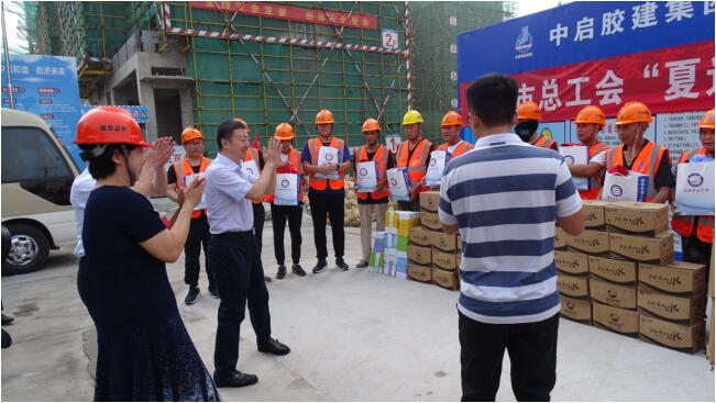 8月19日上午,膠州市委副書記李曉光,膠州市總工會主席姜鵬,副主席孫殿開等一行到中啟膠建集團膠州公司施工建設的新源上城明珠項目施工現場開展“夏送清涼”慰問活動,為炎炎夏日依然奮戰在一線的職工們送上工會的暖心清涼物資和親切的問候。集團黨委副書記、工會主席孫淑云等陪同前往活動現場。