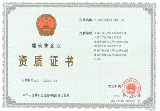 1月30日下午,國家住房和城鄉建設部正式發布公告,中啟膠建集團有限公司順利晉升為市政公用工程施工總承包壹級資質。