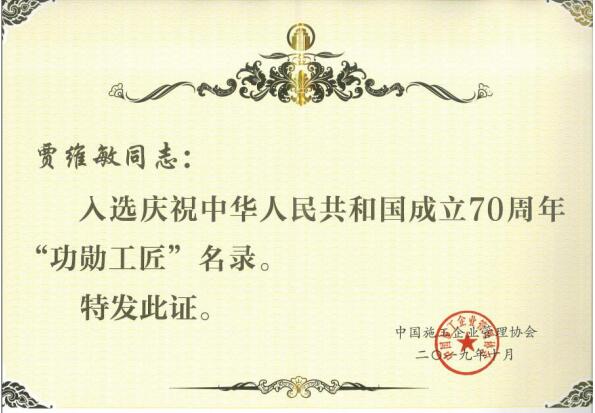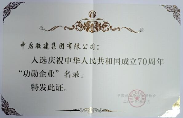 2019年11月16日下午,由中國施工企業管理協會主辦的工程建設行業慶祝中華人民共和國成立70周年宣傳展示總結大會在北京舉行。大會對中華人民共和國成立70周年以來工程建設行業取得卓越成績的百家功勛企業、百項經典工程和百名功勛工匠進行了宣傳表彰。中啟膠建集團榮獲“功勛企業”榮譽稱號,公司員工賈維敏、黃顯宏榮獲“功勛工匠”榮譽稱號。