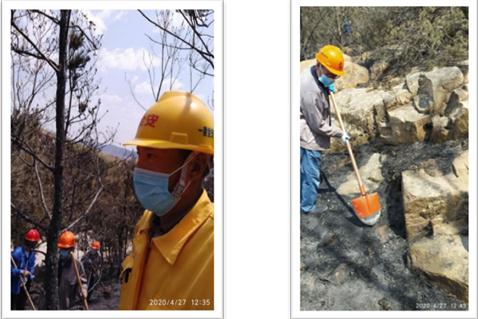 到達(dá)位置后,參戰(zhàn)人員會(huì)同當(dāng)?shù)叵狸?duì)員一起前往險(xiǎn)情發(fā)生地,聽從指揮,嚴(yán)格紀(jì)律。積極沖在清理復(fù)燃物的行動(dòng)中,頂著高溫與干渴連續(xù)奮戰(zhàn)兩天一夜。由于地形復(fù)雜,能見度低,夜晚風(fēng)疾溫度低,參戰(zhàn)人員克服種種危險(xiǎn)與困難。參戰(zhàn)人員緊隨消防官兵身后,一路清理被伐樹木,樹枝及雜草,制造出足夠空間的防火隔離帶。項(xiàng)目全員進(jìn)行拉網(wǎng)式、地毯式排查,山火險(xiǎn)情消滅,確保火情不再?gòu)?fù)燃。等后續(xù)隊(duì)伍到達(dá)后,我方參戰(zhàn)人員撤離現(xiàn)場(chǎng),返回海洋大學(xué)項(xiàng)目部休整,隨時(shí)等待命令再次奔赴一線。