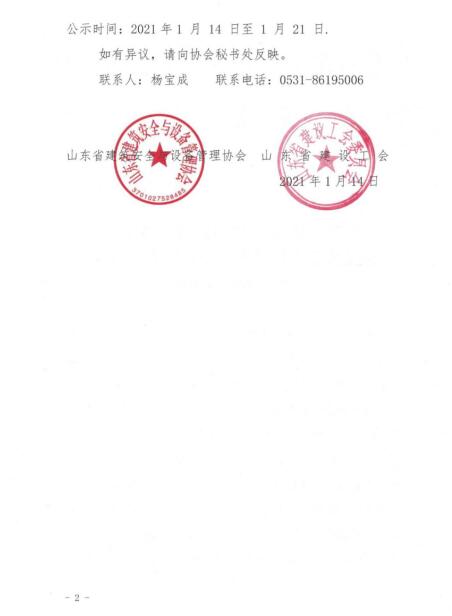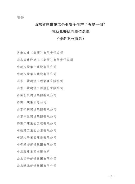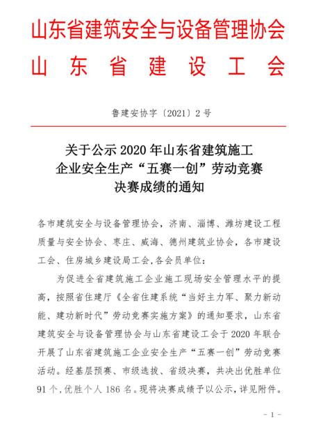 近日,山東省建筑安全與設備管理協會、山東省建設工會下發了《關于公示2020年山東省建筑施工企業安全生產“五賽一創”勞動競賽決賽成績的通知》,我公司經過預賽、市級選撥、省級決賽,成功榮獲“山東省建筑施工企業安全生產‘五賽一創’勞動競賽優勝單位”稱號。