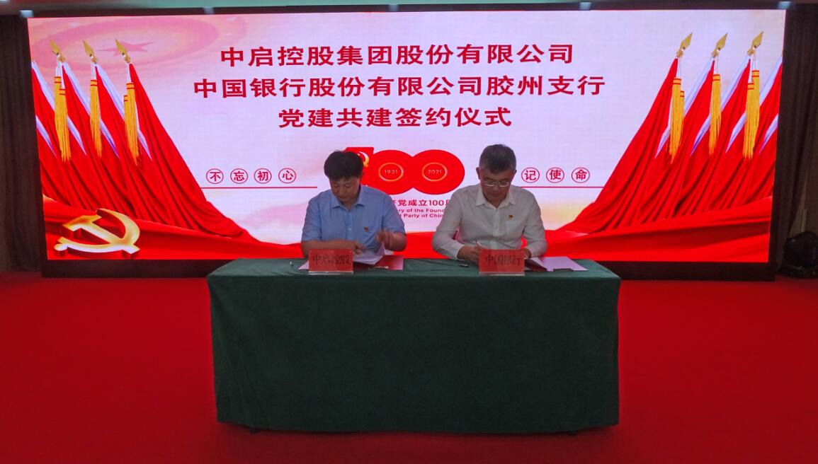 接著中啟控股集團(tuán)與中國銀行膠州支行舉行了黨建共建簽約儀式,雙方將通過黨建共建,實(shí)現(xiàn)資源共享、優(yōu)勢互補(bǔ)、共同提高。