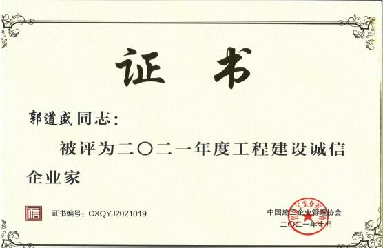 近日,中國施工管理協(xié)會發(fā)布了《關(guān)于公布2021年度工程建設(shè)誠信企業(yè)家評價結(jié)果的通知》,中啟膠建集團(tuán)總經(jīng)理郭道盛獲評“2021年度全國工程建設(shè)誠信企業(yè)家”。