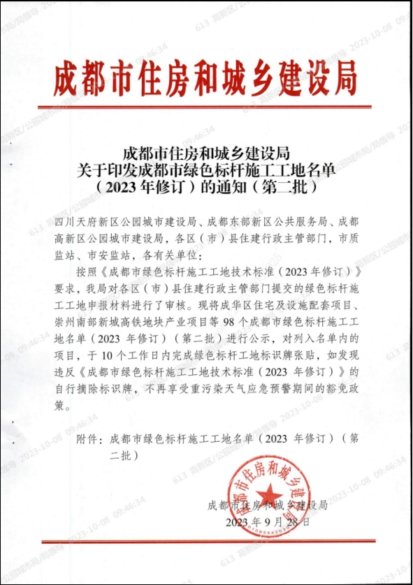 據悉,科研辦公、商業及配套設施項目位于四川省成都市雙流區,其中1號地塊建筑面積24437.21㎡、2號地塊建筑面積32310.72㎡。根據《成都市綠色標桿施工工地技術標準(2023年修訂)》要求,項目部采用智慧化工地系統、揚塵噪聲系統、濕法作業控制、非道路移動機械管理、新能源車輛管理、排污排水管理、食堂管理、腳手架管理、環保材料使用、封閉作業管理、項目施工大門出入口管理、圍擋管理、項目各類公示牌管理共計13項管理手段,使現場達到了綠色標桿工地的標準,于2023年9月順利通過成都市住房和城鄉建設局現場評審,最終獲評此項殊榮。