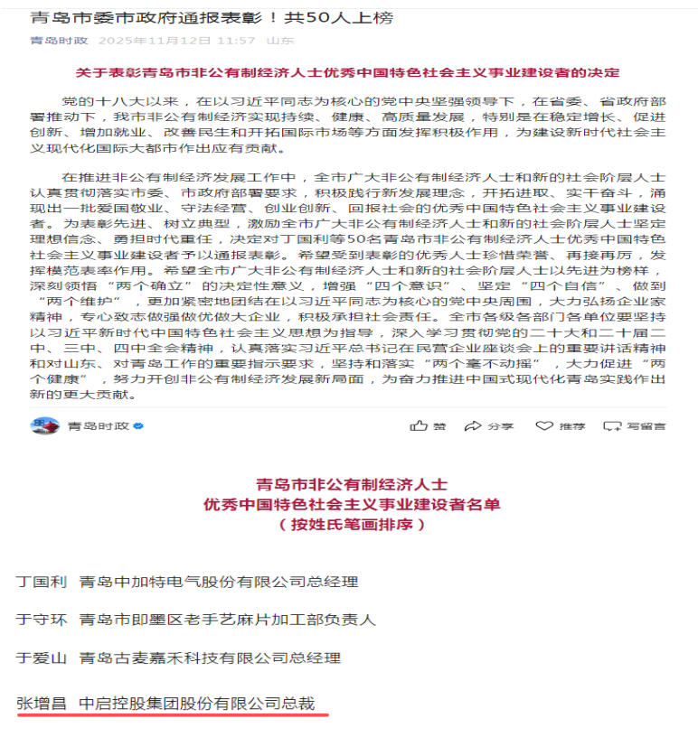11月12日,青島時(shí)政新聞網(wǎng)公布了青島市委市政府《關(guān)于表彰青島市非公有制經(jīng)濟(jì)人士?jī)?yōu)秀中國(guó)特色社會(huì)主義事業(yè)建設(shè)者的決定》,集團(tuán)黨委書(shū)記、總裁張?jiān)霾?0人光榮上榜。